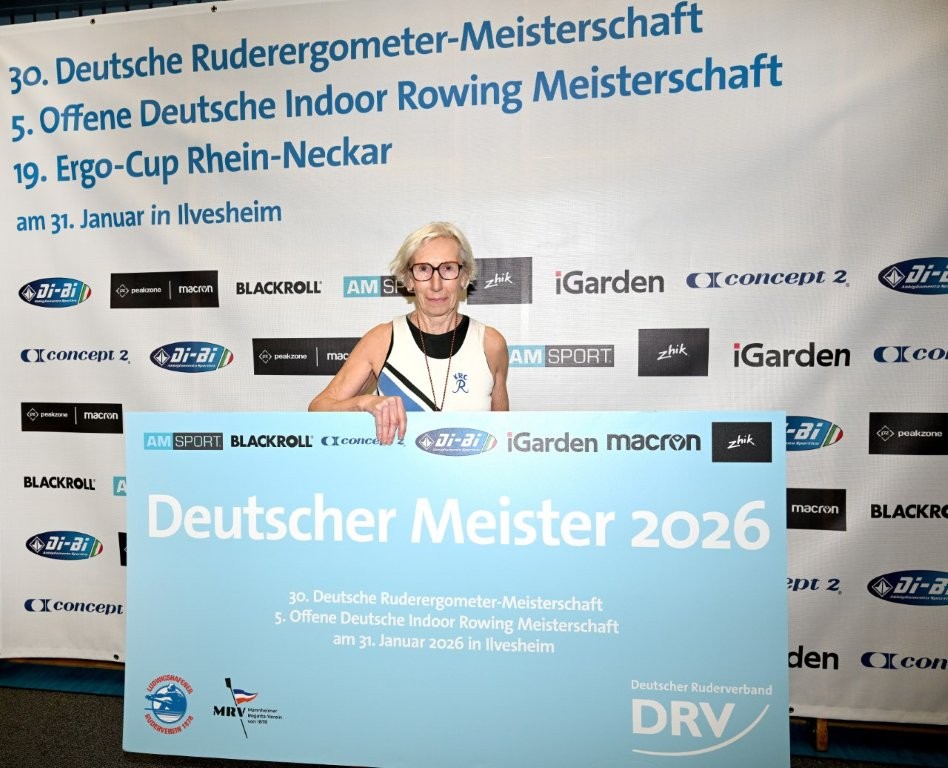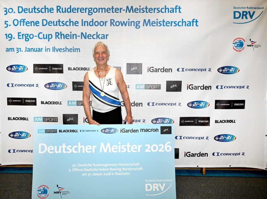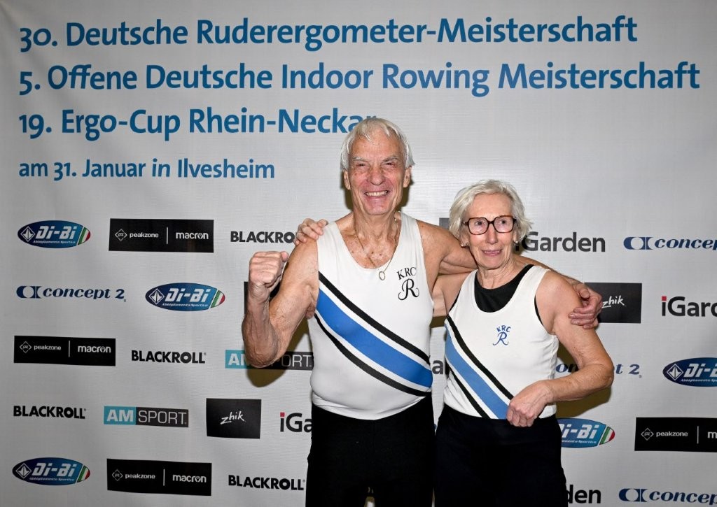 Die Deutschen-Ruderergometer- Meisterschaften fanden am 31.Januar 2026 in Mannheim-Ilvesheim in der “Neckarhalle” statt. Sie sind eines der größten Indoor- Highlights des deutschen Rudersports mit über 420 Meldungen aus 58 Vereinen. Klaus Opitz (84) und Gabriele Alsbach (70) vom KRCR, gingen in ihren jeweiligen Altersklassen an den Start. Während es bei Klaus keine Gegenmeldung gab, hatte Gaby Mitstreiterinnen. “Da ich mich auf dieses Rennen sehr intensiv vorbereitet hatte, war es für mich klar, die 1000-Meterstrecke, ohne Wenn und Aber voll anzugehen. Meine Zeit von 3:44:49 Minuten fand lobende Worte durch den Moderator, da sie von einem 84-Jährigen erzielt wurde; zumal der Sieger bei den 10 Jahre jüngeren Athleten nur um 0,6 Sekunden schneller war”, freute sich Klaus. Gaby siegte mit großartigem Kampfeswillen und technisch sauberer Ruderarbeit in der Zeit von 3:54:05 Minuten deutlich vor der Ruderin aus Köln. Es gelang ihr sogar die gleiche Zeit von 2025, als sie noch einen Jahrgang jünger startete, wieder zu erreichen.